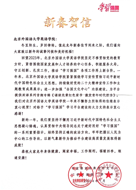 (中宣部宣传舆情研究中心“学习强国”学习平台发来的新春贺信)