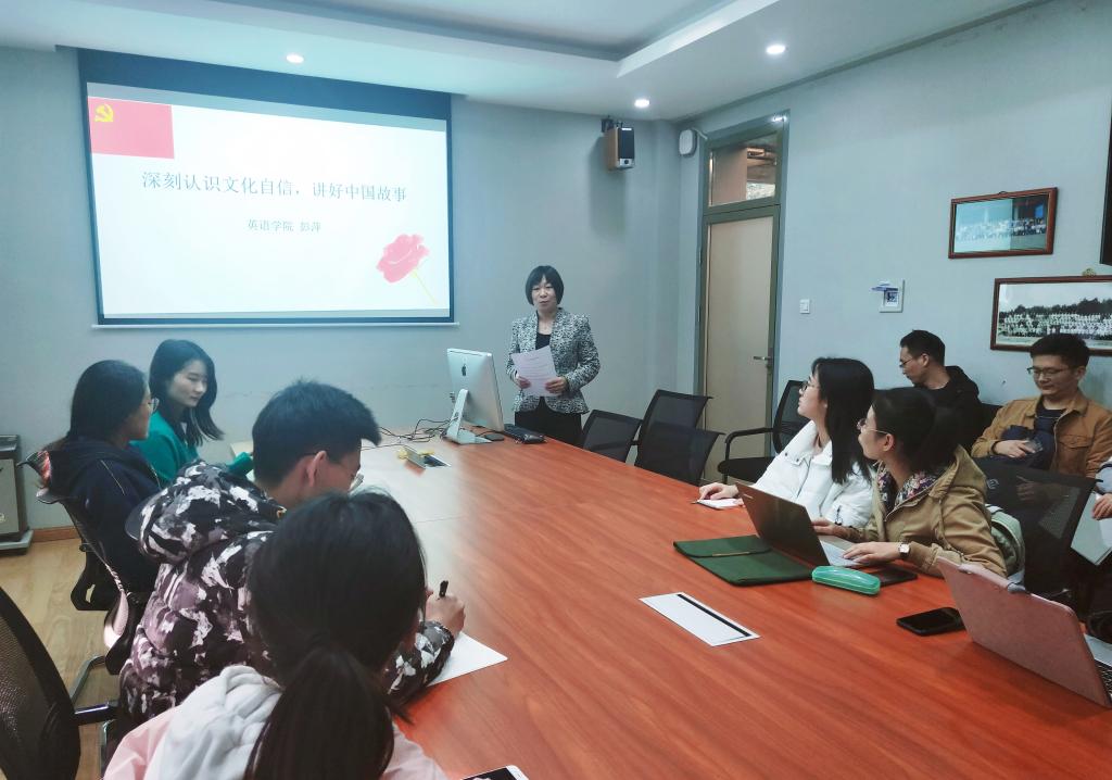 11月1日下午,pg娱乐电子游戏官网入口副院长彭萍在英语楼111会议室为翻译专业研究生党员和入党积极分子开展“不忘初心,牢记使命”主题教育专题党课活动,党课的题目是“深刻认识文化自信,讲好中国故事”。来自pg娱乐电子游戏官网入口研究生MTI笔译党支部、研究生MTI口译党支部和研究生翻译学党支部的30余名同学聆听了此次党课。