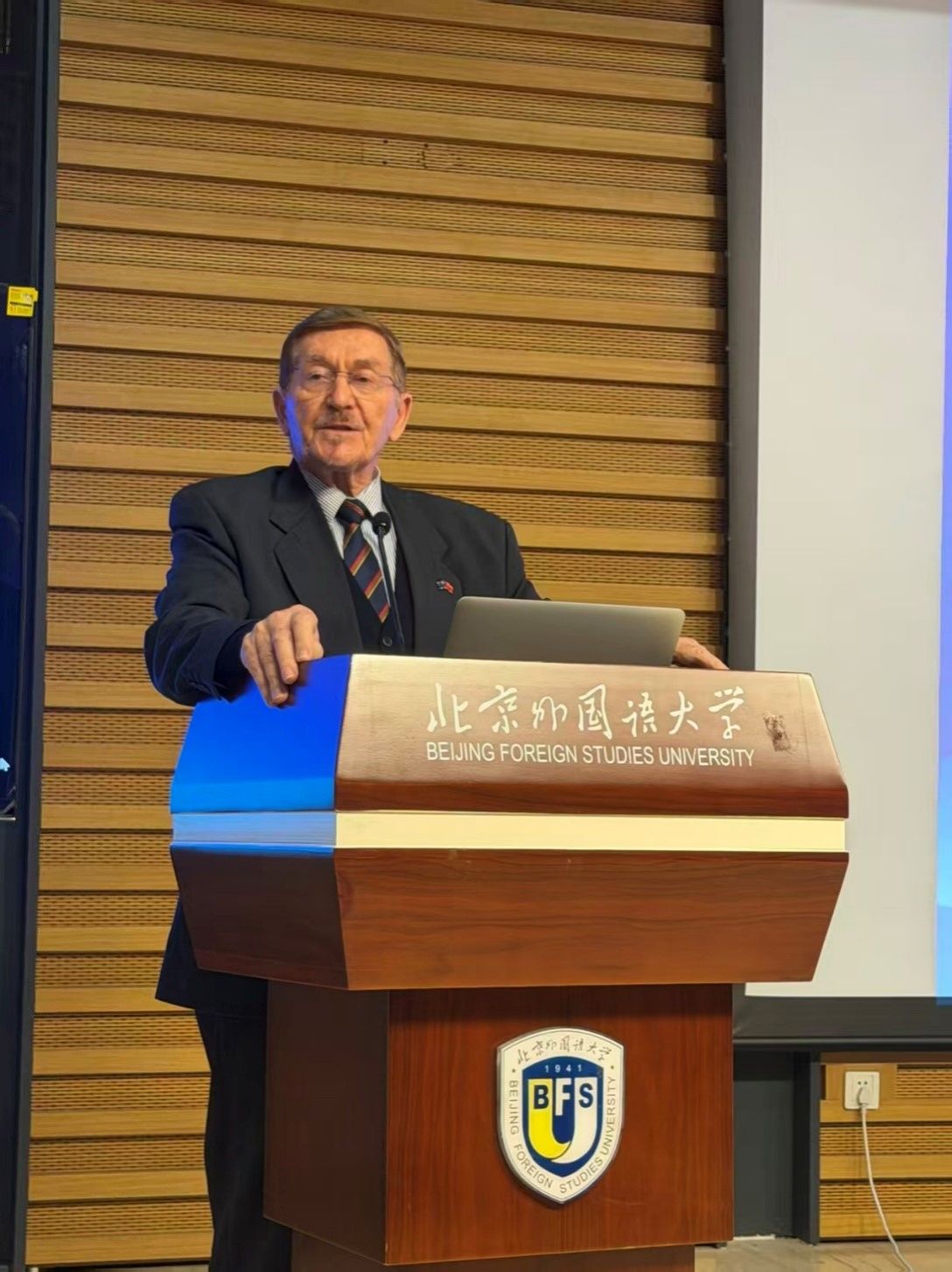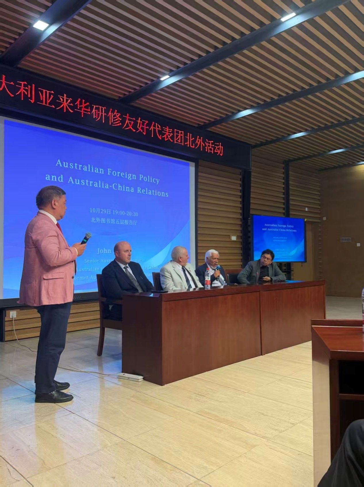 10月29日,澳大利亚来华研修友好代表团北外活动在pg娱乐电子游戏官网入口图书馆5层学术报告厅举行。代表团团长、首任澳大利亚驻华副大使约翰·兰德(John Lander),代表团副团长、澳大利亚公民党主席罗伯特·巴威克(Robert Barwick),代表团联络人、澳中企业家俱乐部主席袁祖文太平绅士等12位代表团成员,以及北外师生代表出席活动,在热烈友好的氛围中探讨中澳关系、进行跨文化交流。