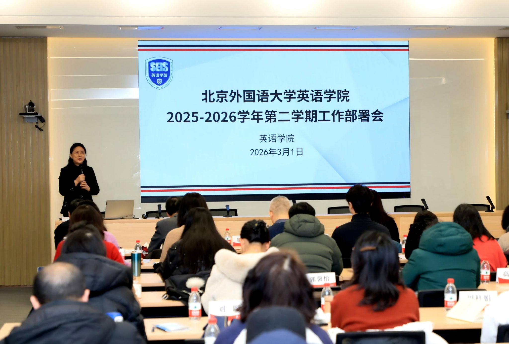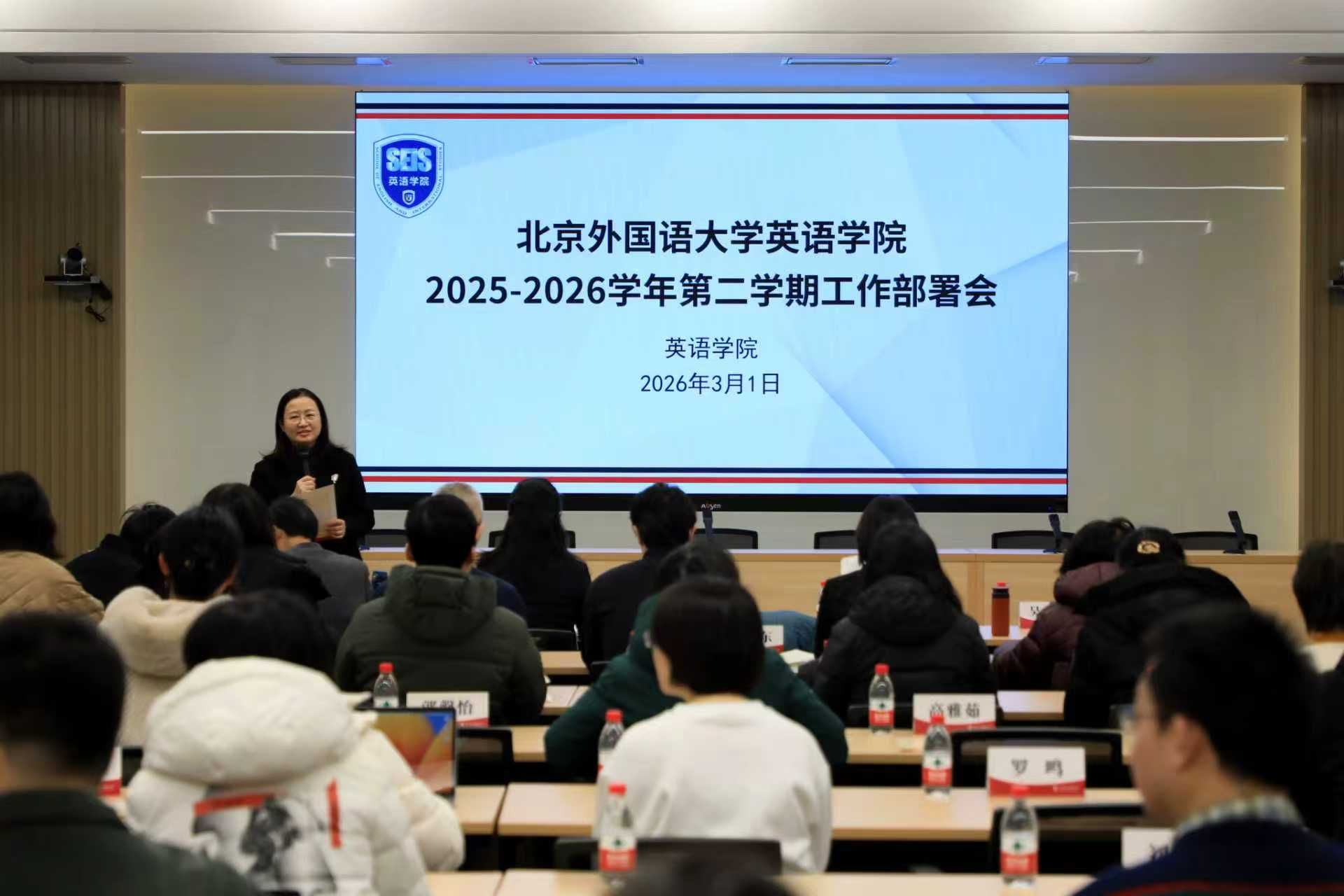 副院长张小东、张威汇报本科与研究生教学安排。会议强调分层培养目标,培养兼具家国情怀与国际视野的高端复合型人才,持续推进“人工智能+”教学改革和教材建设。副院长彭萍介绍科研与对外合作工作,继续举办“北外大讲堂”“知周讲堂”,推进高层次项目申报,承办2026国际英语教育中国大会,拓展高端引智与合作办学。