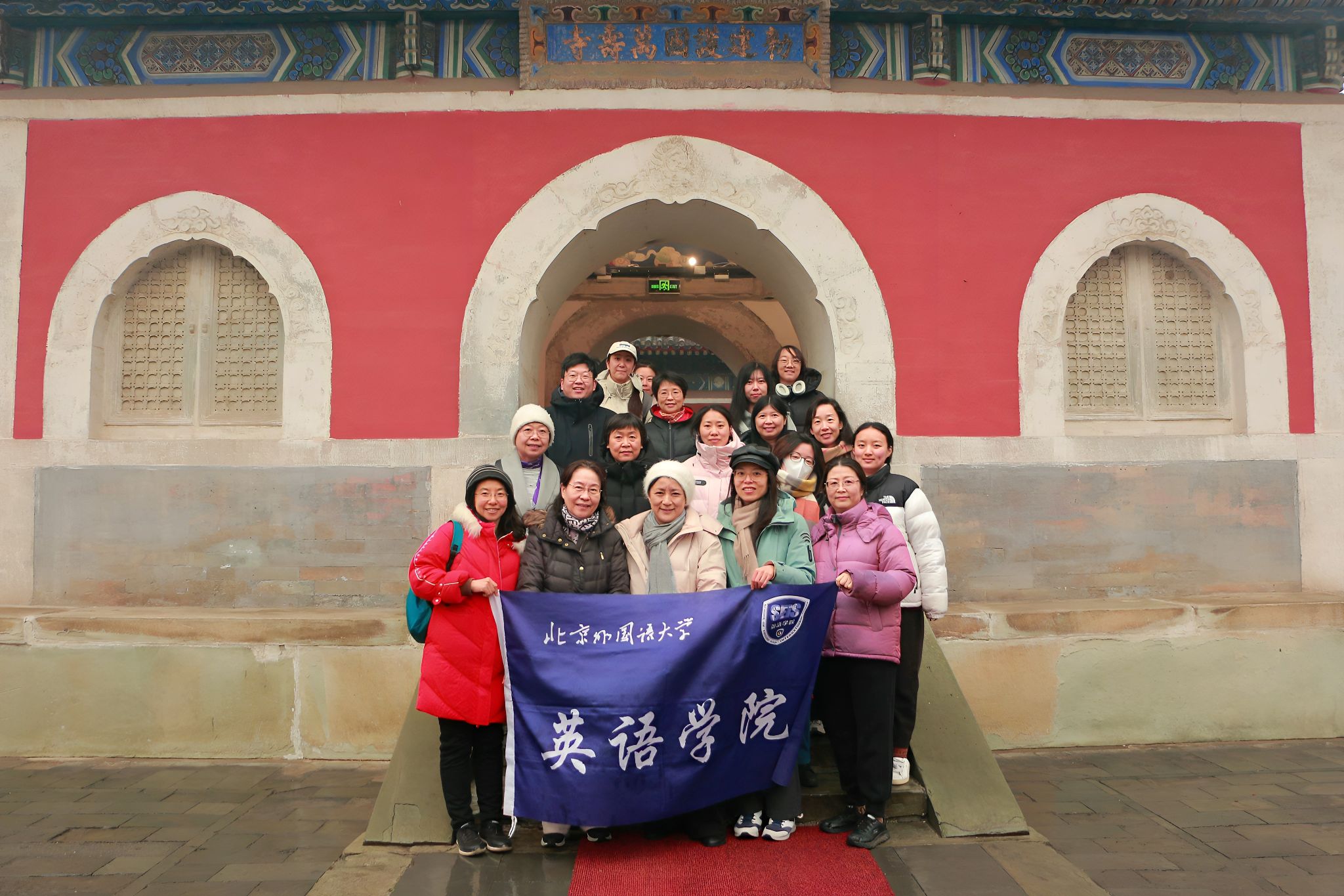 下午1点半,学院教职工们准时在万寿寺西门口集合,在飞檐斗拱、红墙绿树的映衬下合影留念。雨雪中的万寿寺更显古朴沉静,仿佛带人穿越时空,步入悠长的历史长廊。