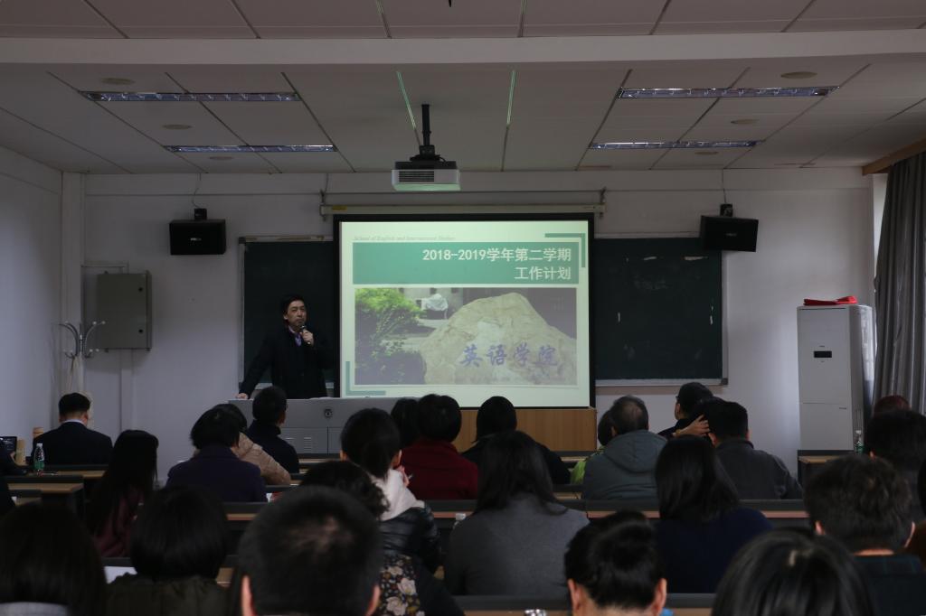 会上,pg娱乐电子游戏官网入口院长张剑分别从学科建设、教学工作、科研工作、国际合作、党建及学生工作和人事工作六方面对学院新学期的工作进行部署。学科建设方面,学院本学期将继续做好慕课建设、南太平洋语种建设与师资培养工作,同时,着手外交外事高级翻译专业建设。本科教学方面,本学期将完成本科二年级学科方向分流工作、继续开展写作和语音辅导、筹备教学开放周活动等,同时,本科生毕业论文答辩工作也将在本学期进行;研究生教学方面,将落实MTI专业校外实践导师机制,探讨MTI专业设置、研究生教学督导、语言学专业定位等问题,同时也需保证硕士、博士研究生的招生、毕业论文答辩等环节顺利开展。科研工作方面,学院鼓励教师积极申报一流学科建设项目、基本科研业务经费、国家社科基金等项目,也将推进教育部国别区域研究基地、索引智库、备案中心等工作和研究生相关学术活动。国际合作方面,学院将与世界著名大学积极往来、增加合作,完成外教招聘和选派学生出国等工作。党建及学生工作方面,学院本学期将继续加强理论学习,做好党员培养与发展工作,指导帮助学生学业与职业发展及就业工作、促进学生身心健康。此外,将积极开展工会及校友相关工作。