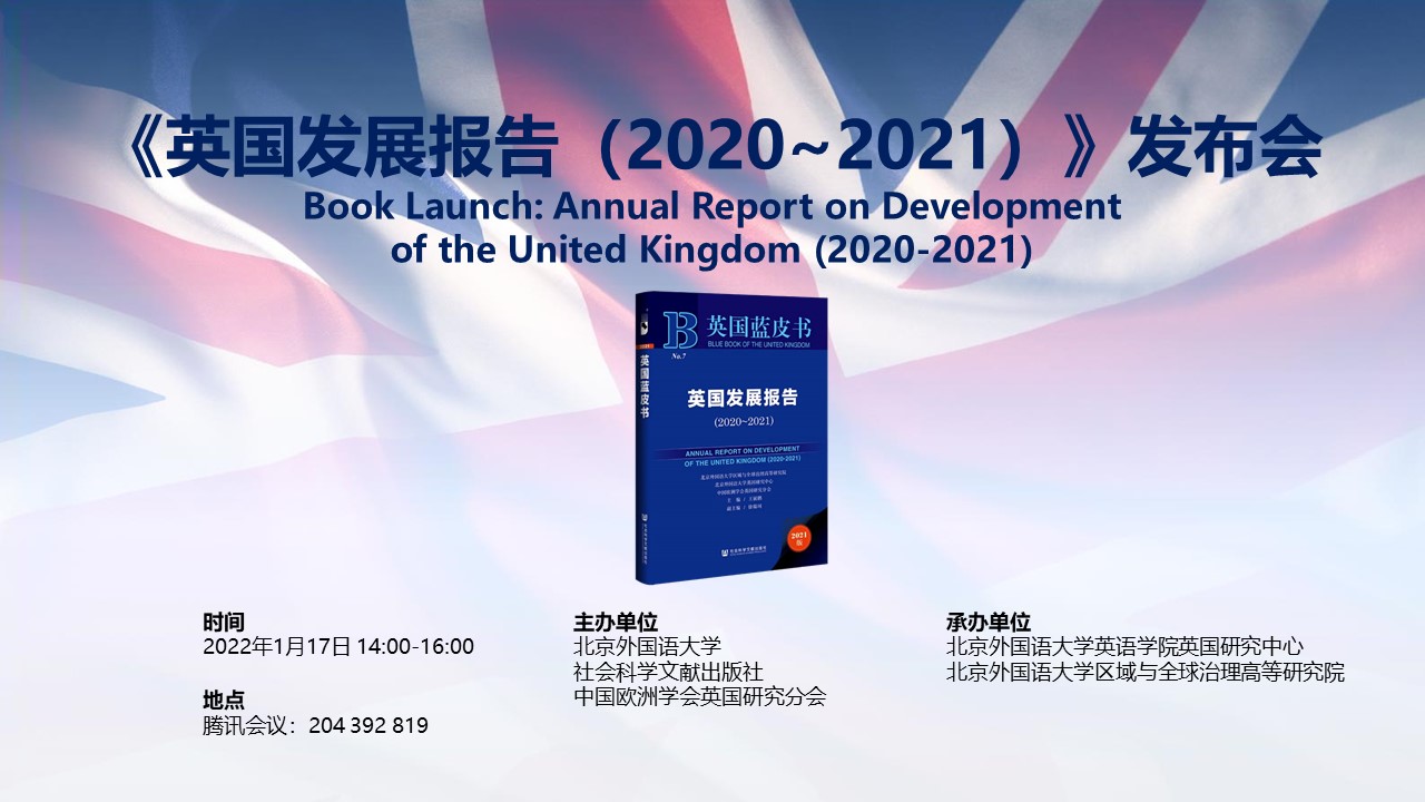 1月17日,《英国发展报告(2020-2021)》发布会线上举行。此次发布会由pg娱乐电子游戏官网入口、社会科学文献出版社、中国欧洲学会英国研究分会主办,北外pg娱乐电子游戏官网入口英国研究中心、区域与全球治理高等研究院承办。开幕式由pg娱乐电子游戏官网入口副院长、区域与全球治理高等研究院副院长王展鹏主持。