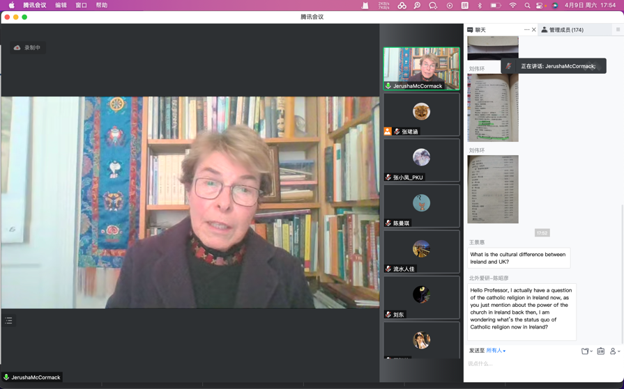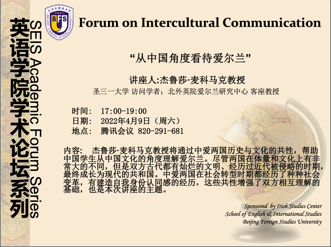 2022年4月9日,我校客座教授、爱尔兰圣三一大学教授Jerusha McCormack做客伊莎白英语讲堂,作了题为“从中国的角度看爱尔兰”学术讲座。讲座由北外pg娱乐电子游戏官网入口爱尔兰研究中心主任王展鹏教授主持。陈丽教授、张珺涵、爱研学生、其他院系对爱尔兰有兴趣的学生、以及校外师生等170余人参与了本次讲座。