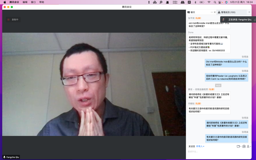 邱方哲老师从爱尔兰语的分类地位讲起,阐明了“爱尔兰人是一个动态的概念,但爱尔兰语是有明确分类的”这一观点。之后,邱老师按照爱尔兰语从古至今的发展顺序,讲述了原始爱尔兰语及其文字、早期爱尔兰语的文字及其手稿、书本等原始资料、古爱尔兰语的发展背景和它在文化和语言交流中所起到的突出作用。邱老师的讲座中借助大量的例子,用生动的语言为参加讲座的老师和同学们奉献了一场知识性与趣味性并重的讲座。随后,邱方哲老师细心地回答了同学和老师们提出的关于爱尔兰语民间语言传统、印欧语词源研究等问题,讲座持续了一个半小时,最后张珺涵老师对于邱方哲老师表达了感谢。