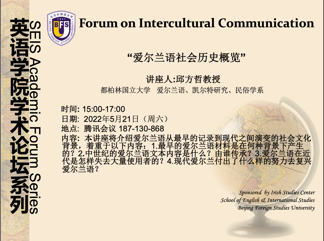 2022年5月21日,爱尔兰都柏林大学学院助理教授邱方哲做客伊莎白英语讲堂,作了题为“爱尔兰语社会史:从史前到中世纪”学术讲座。讲座由北外pg娱乐电子游戏官网入口爱尔兰研究中心教师张珺涵主持。英院爱尔兰研究的学生、爱尔兰语三外学习者、其他院系对爱尔兰有兴趣的学生、以及校外师生等110余人参与了本次讲座。