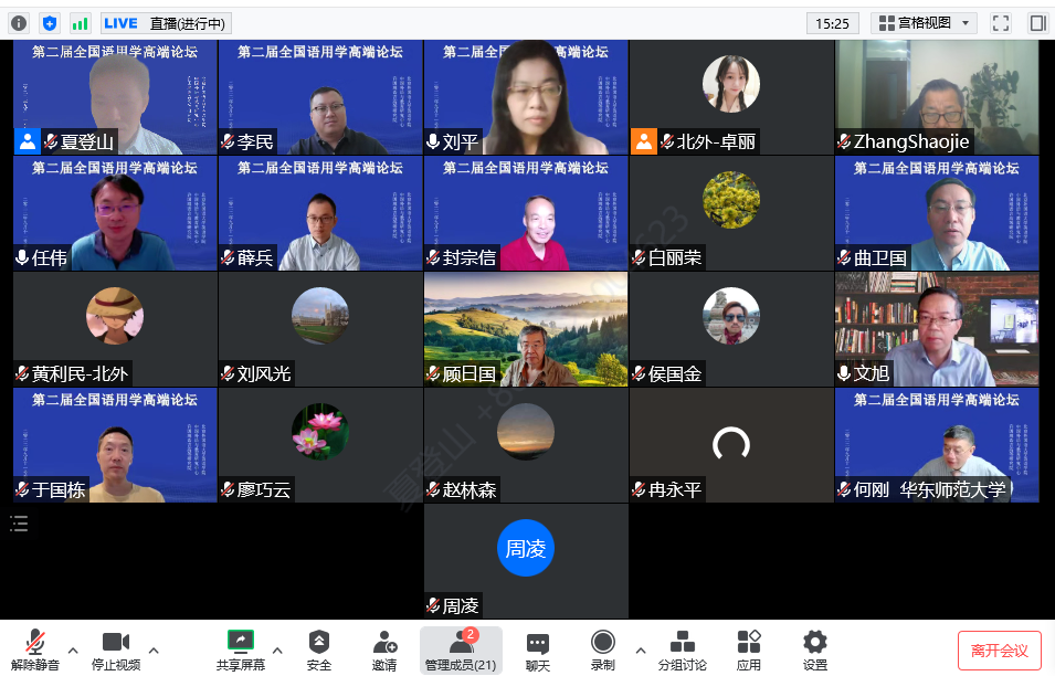 2022年9月11日至12日,pg娱乐电子游戏官网入口、中国外语与教育研究中心和许国璋语言高等研究院联合召开了“第二届全国语用学高端论坛”。本次论坛由pg娱乐电子游戏官网入口黄教授召集,pg娱乐电子游戏官网入口夏登山教授组织,共邀请了28名全国语用学界知名学者在线上进行深度交流,主题包括会话蕴涵、言语行为、(不)礼貌研究、实验语用学、语用—语义界面研究等语用学经典论题及当前的热点话题,力图反映当前中国语用学研究的最高水平。