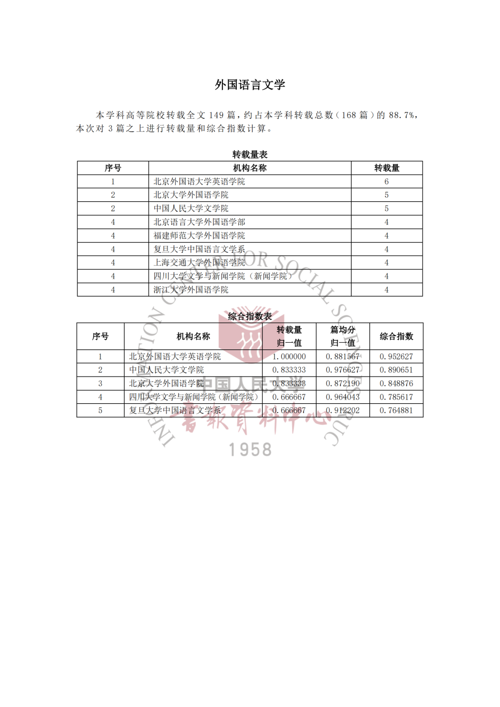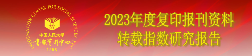 由中国人民大学书报资料中心研制的《2023年度复印报刊资料转载指数研究报告》于2024年4月25日正式发布。中国人民大学书报资料中心根据2023年度复印报刊资料学术系列刊的全文转载数据,从转载量、转载率和综合指数3个量度,分别研制了期刊和机构的转载指数。其中根据论文作者所属机构,从转载量和综合指数两个量度,按学科分别统计分析高校及其所属机构复印报刊资料转载指数。