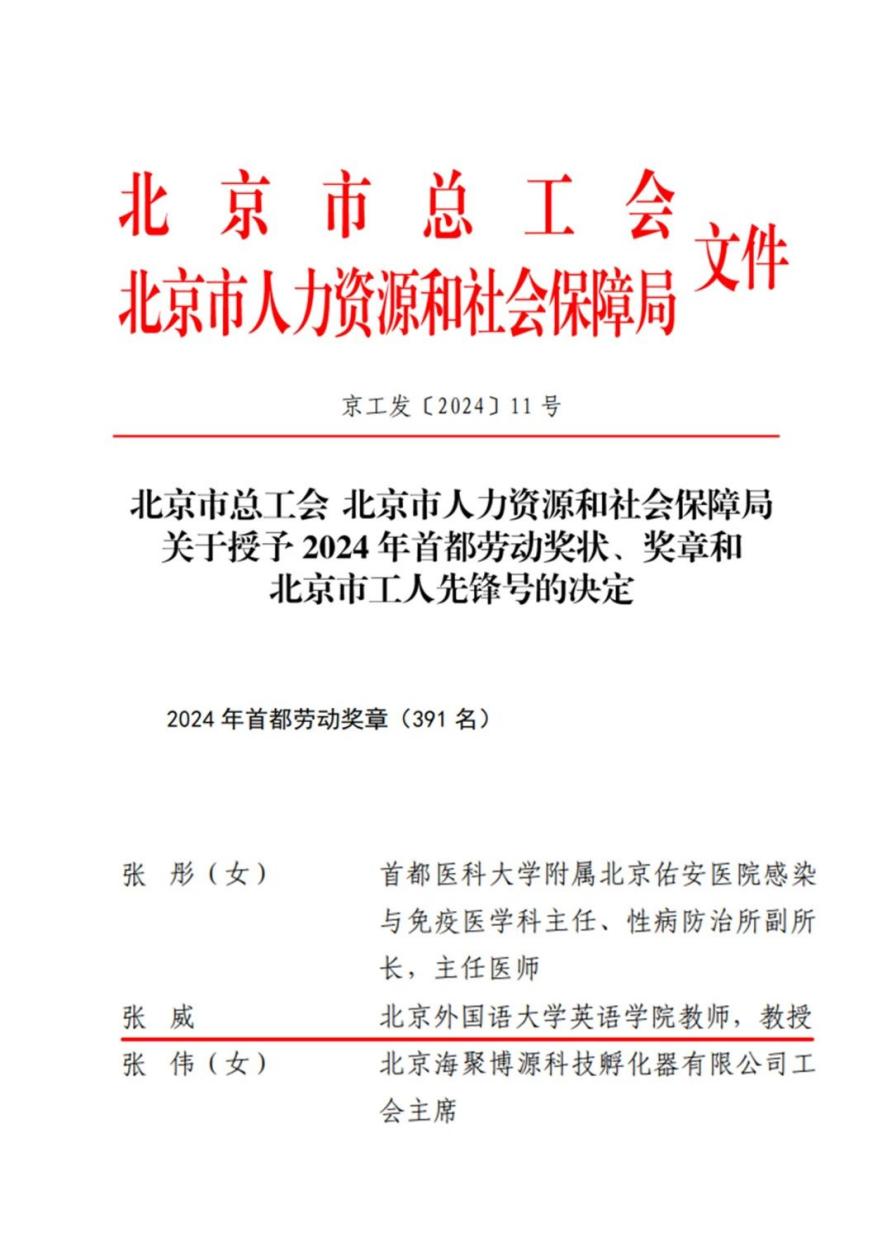 为深入学习贯彻党的二十大精神和中国工会第十八次全国代表大会精神,大力弘扬劳模精神、劳动精神、工匠精神,近日,北京市总工会、北京市人力资源和社会保障局在全市范围内开展2024年首都劳动奖状、奖章和北京市工人先锋号推荐评选工作,最终授予北京市76个单位“首都劳动奖状”称号,391名同志“首都劳动奖章”称号,授予148个班组(团队)“北京市工人先锋号”称号。pg娱乐电子游戏官网入口张威教授荣获“首都劳动奖章”,这是北外教师首次获得该荣誉。