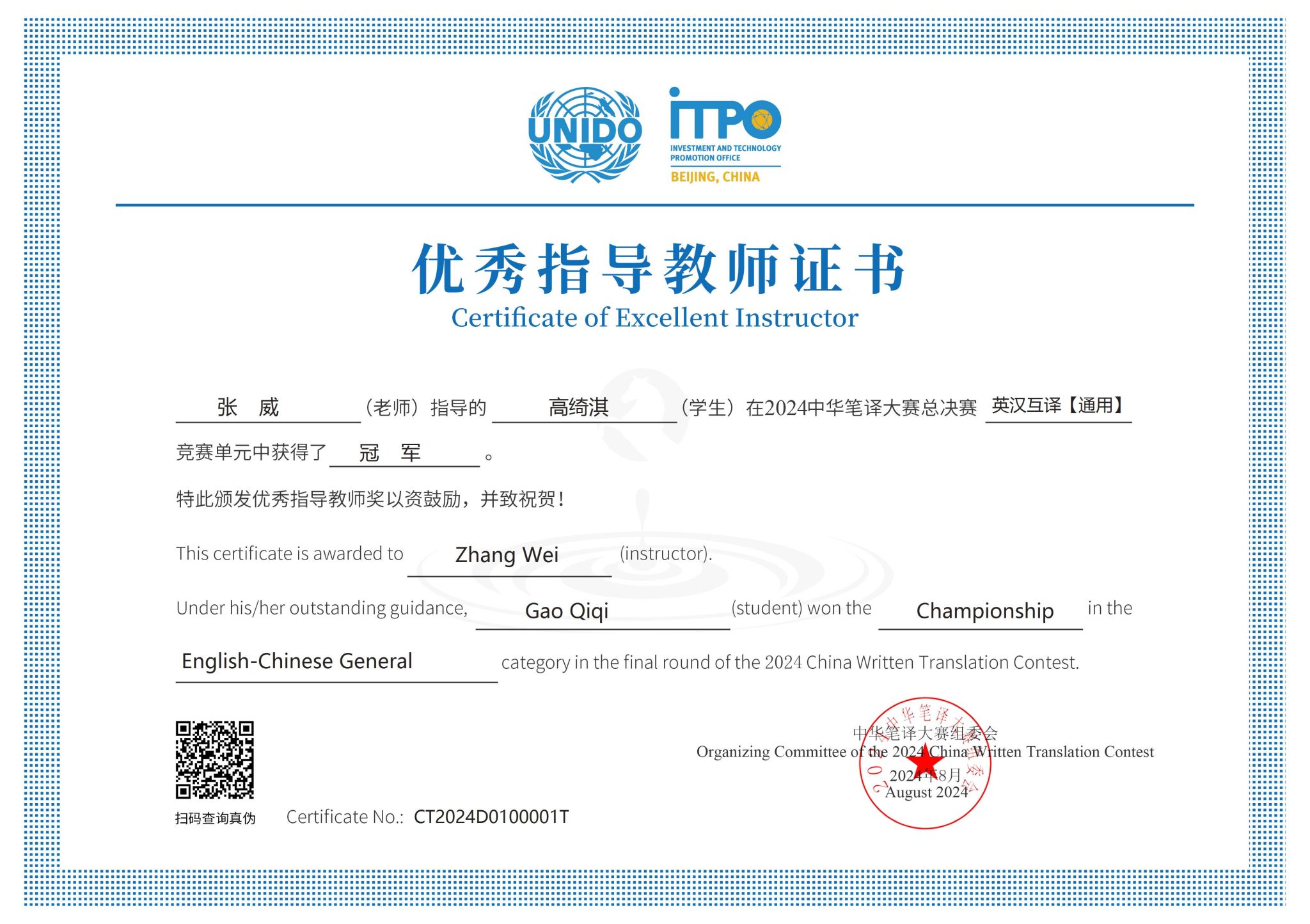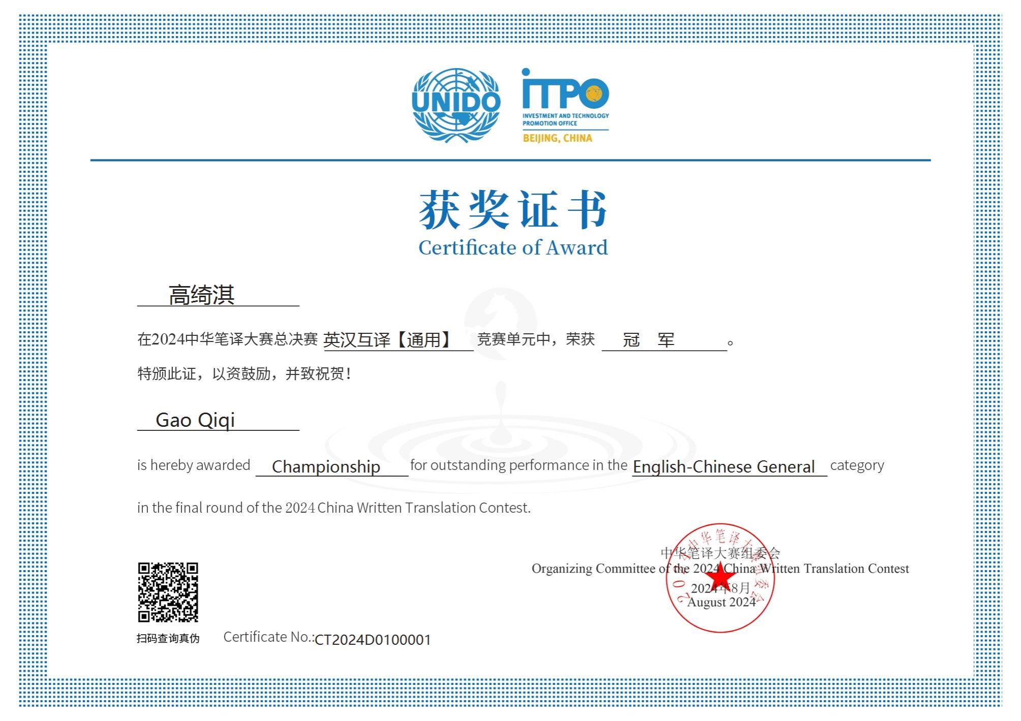 近日,由联合国工业发展组织官方指导和支持,联合国工业发展组织投资和技术促进办公室(中国·北京)和北京策马翻译有限公司(联合国官方翻译服务供应商)共同主办的2024中华笔译大赛结果揭晓。pg娱乐电子游戏官网入口2023级英语口译专业研究生高绮淇在张威教授指导下积极准备,比赛中发挥出色,在激烈竞争中脱颖而出,最终荣获中华笔译大赛总决赛英汉互译“通用”组冠军,张威教授获得优秀指导教师奖。