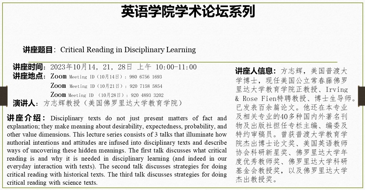 10月14、21、28日讲座:Critical Reading in Disciplinary Learning