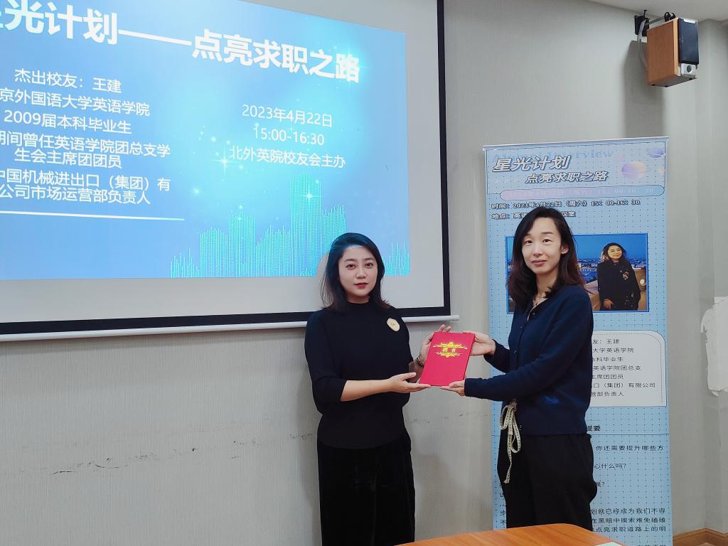 活动结束后,pg娱乐电子游戏官网入口校友事务办公室主任王欣扬代表学院向王建校友颁发pg娱乐电子游戏官网入口“星光计划”学生成长导师聘书。