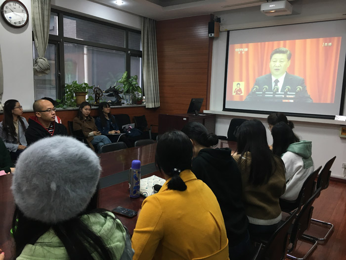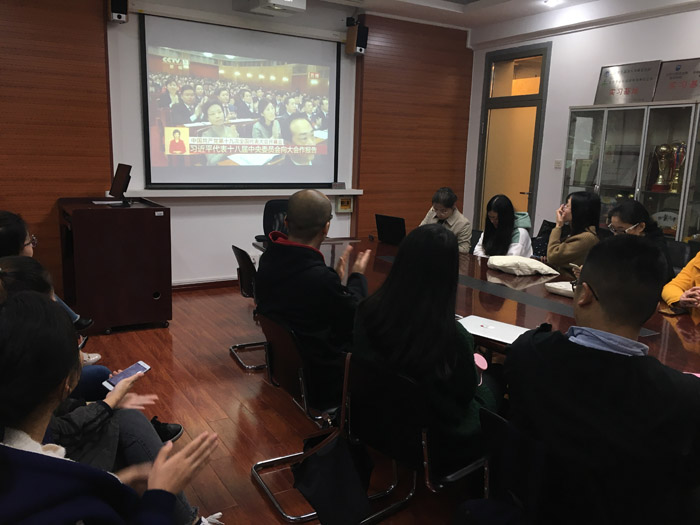 ——10月18日上午9:00,pg娱乐电子游戏官网入口组织辅导员、各学生党支部书记、各团支部书记、优秀学生代表收看中国共产党第十九次全国代表大会开幕式,听取习近平同志代表十八届中央委员会向大会所作报告并学习报告。