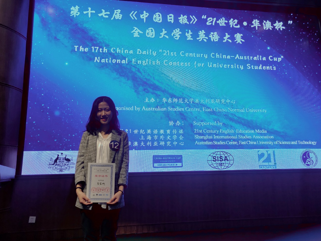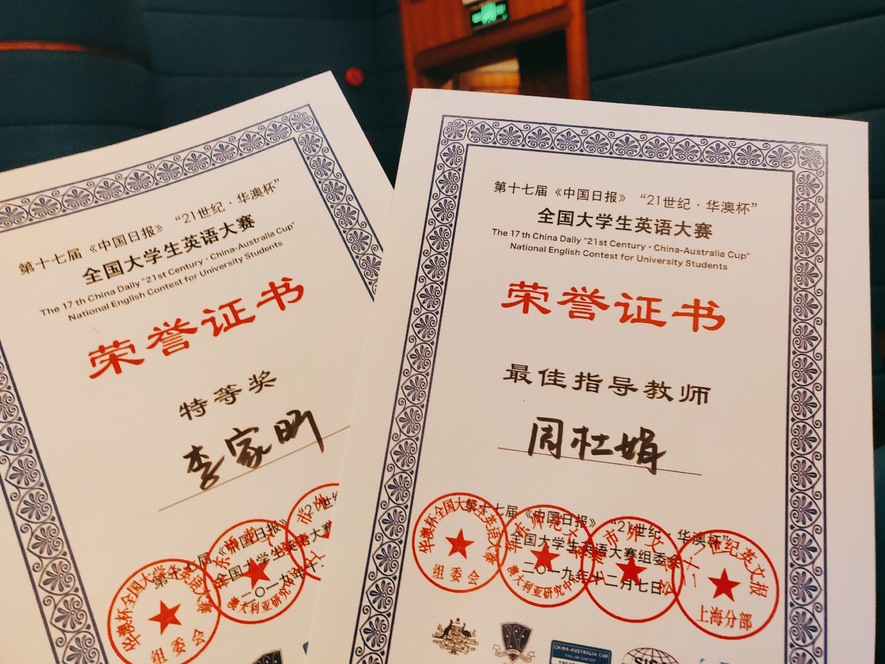 12月7日,由华东师范大学澳大利亚研究中心主办,中国日报21世纪英文报、上海市外文学会、华东理工大学澳大利亚研究中心协办的第十七届《中国日报》“21世纪·华澳杯”全国大学生英语大赛圆满落幕。我校pg娱乐电子游戏官网入口2017级本科生李家昕在26所高校选手中脱颖而出,夺得冠军,荣获特等奖。周杜娟老师获最佳指导老师。
