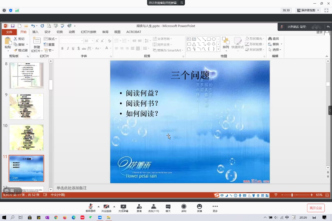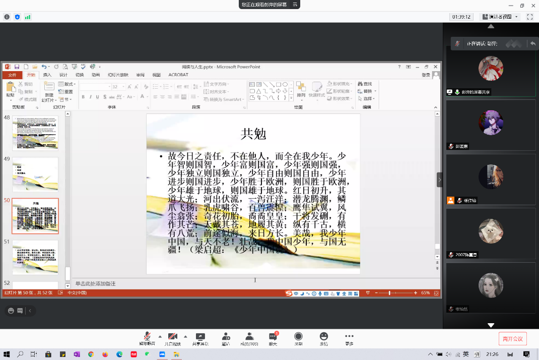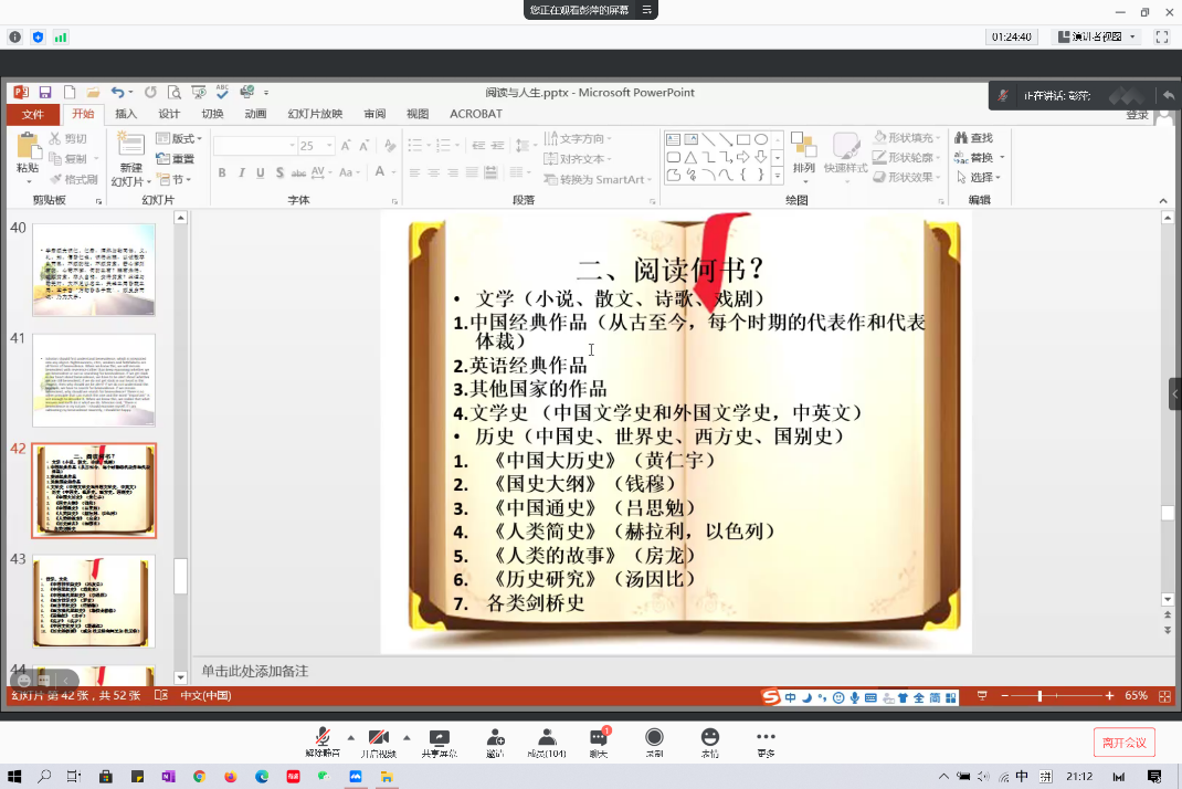 2021年1月25日晚,pg娱乐电子游戏官网入口在假期伊始举办 “阅读与人生”线上专题讲座。本次讲座邀请pg娱乐电子游戏官网入口副院长彭萍教授为同学们讲述阅读与人生的关系,带领大家体验阅读的乐趣,掌握阅读的方法。
