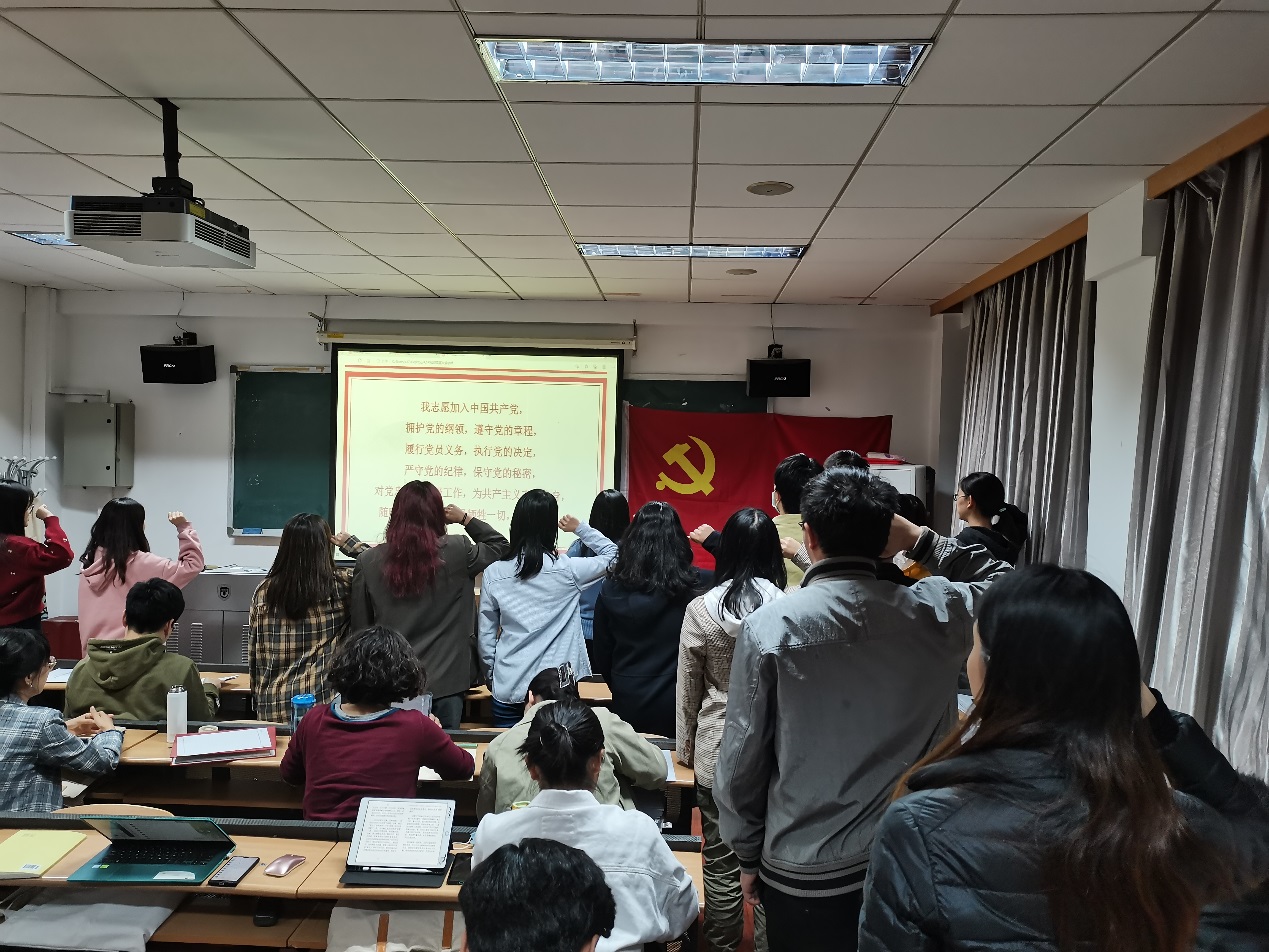 会上,同志们通过一则视频短片,回顾了中国共产党百年奋斗历程中入党誓词的变迁。随后在孙琳同志的带领下,16位预备党员面向党旗庄严宣誓。之后同志们对于本学期支部的党员发展工作进行了讨论。