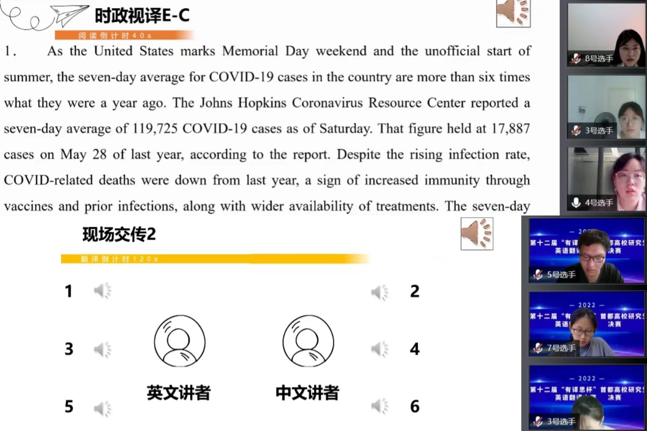 2022年6月11日下午,第十二届北外“有译思杯”首都高校研究生英语翻译大赛决赛于线上成功举办。本次大赛由pg娱乐电子游戏官网入口团总支和研究生会主办,北京20多所高校pg娱乐电子游戏官网入口(外文系)研究生会协办,北京有译思教育科技有限公司冠名赞助。