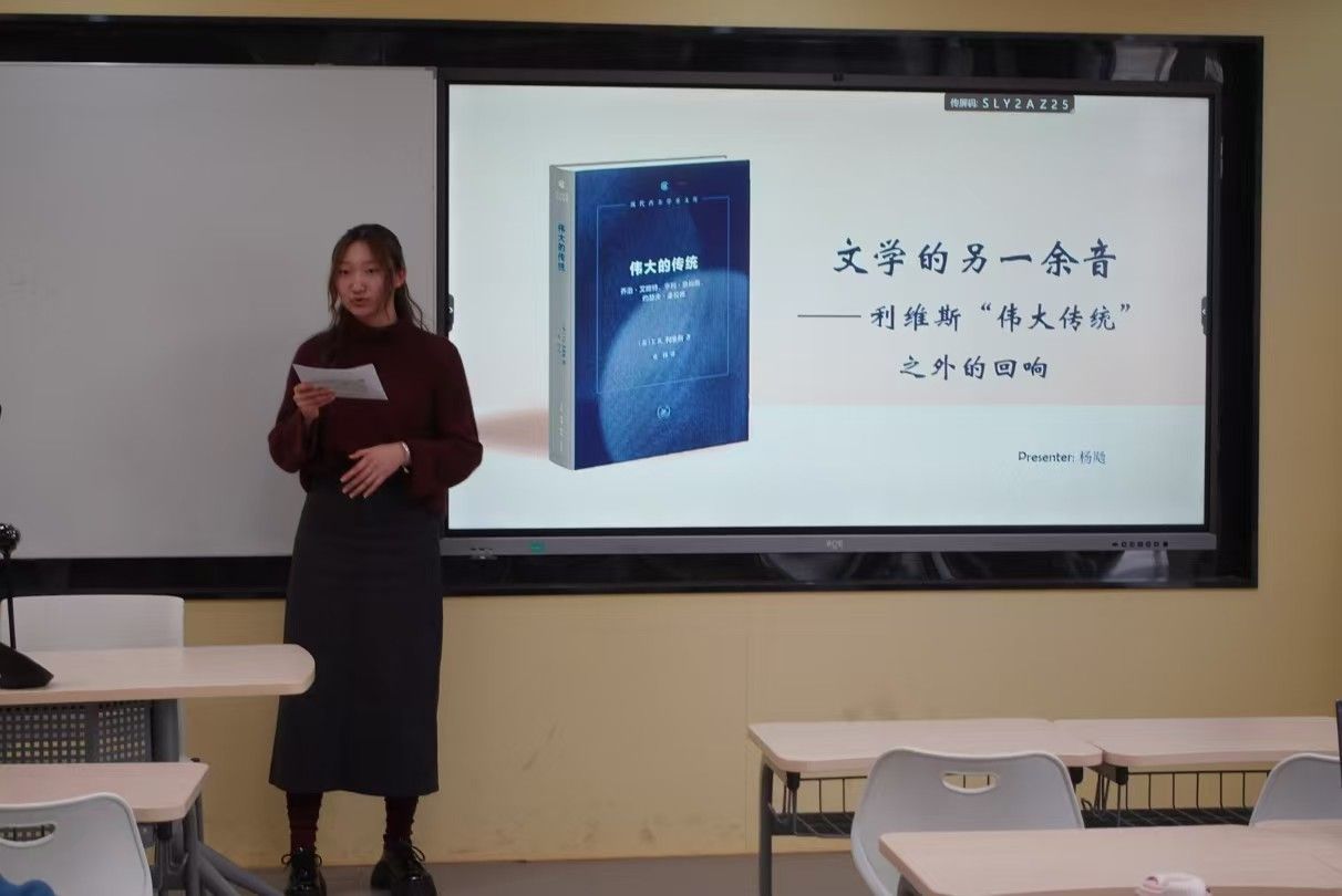 首场活动以《翻译、历史与文化论集》为研讨书目,翻译学方向博士生白一博、赵燕飞担任评委,通过专业点评引导同学们深入探讨翻译理论与实践。在自由研讨环节,与会人员围绕“AI时代翻译学子的机遇与挑战”展开热烈讨论,共同探讨如何利用新兴技术为译者的跨语言交流传播赋能。第二场分享会由英院教师齐皓、邵雪萍与语言学方向研究生李安宁共同担任评委。活动设置文学、国别研究和语言学三个单元。既有对《伟大的传统》中文学批评理论的探讨,也有对美国社会文化认同问题的分析,还包括对语言本质及其与思维关系的讨论。现场学术氛围浓厚,师生互动热烈。
