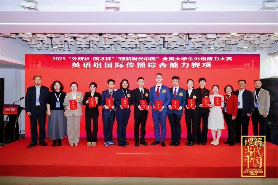 “外研社 国才杯”“理解当代中国”全国大学生外语能力大赛英语组国际传播综合能力赛项全国银奖:2025级(外交外事高级翻译)本科生吴修琪、2024级本科生彭镜霓、戴雨辰、魏吉阳、2022级本科生高艺菲。