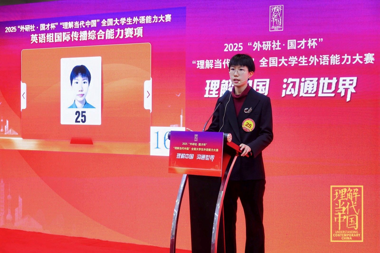 “外研社 国才杯”“理解当代中国”全国大学生外语能力大赛英语组国际传播综合能力赛项全国金奖:2025级(外交外事高级翻译)本科生李湉宇。