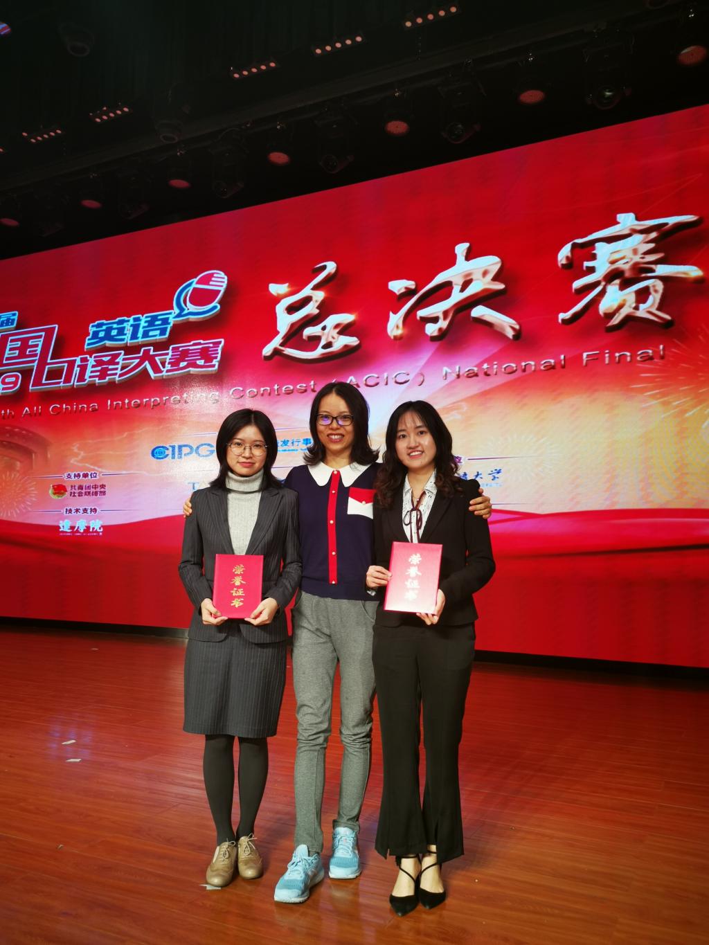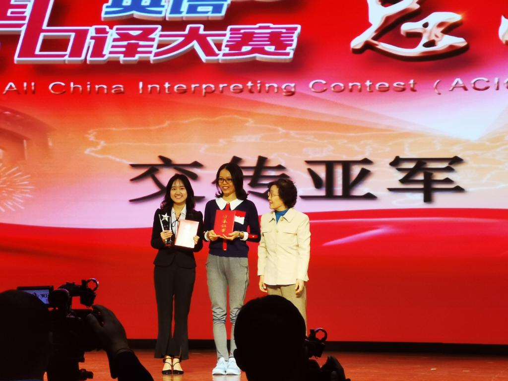 第八届全国口译大赛(英语)总决赛于2019年10月18日至19日在pg娱乐电子游戏官网入口千人礼堂举行。经过两天的激烈角逐,我院学子取得优秀成绩。其中,金羽菲同学获交传亚军、同传邀请赛二等奖,尹佩璇同学获交传二等奖,侯玉颖同学获交传三等奖,王颖冲老师获优秀指导教师奖。pg娱乐电子游戏官网入口毕业生、口译俱乐部队员王静怡获得交传冠军和同传季军。