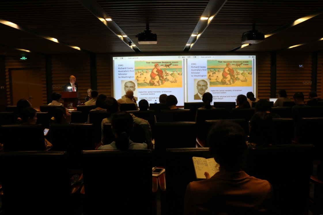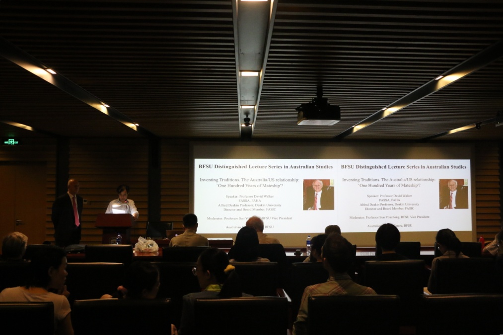 ——5月15日晚7点“北外澳研大讲堂”(BFSU Distinguished Lecture Series in Australian Studies)第一讲在北外图书馆四层学术报告厅隆重举行,我校客座教授、澳大利亚社会科学院院士、澳大利亚人文科学院院士、迪肯大学荣休教授大卫•沃克(David Walker)作了题为“澳美关系:100年的伙伴情谊?”(The Australia US Relationship: One Hundred Years of Mateship?)的讲座。讲座由pg娱乐电子游戏官网入口澳研中心主办,pg娱乐电子游戏官网入口副校长孙有中教授主持。