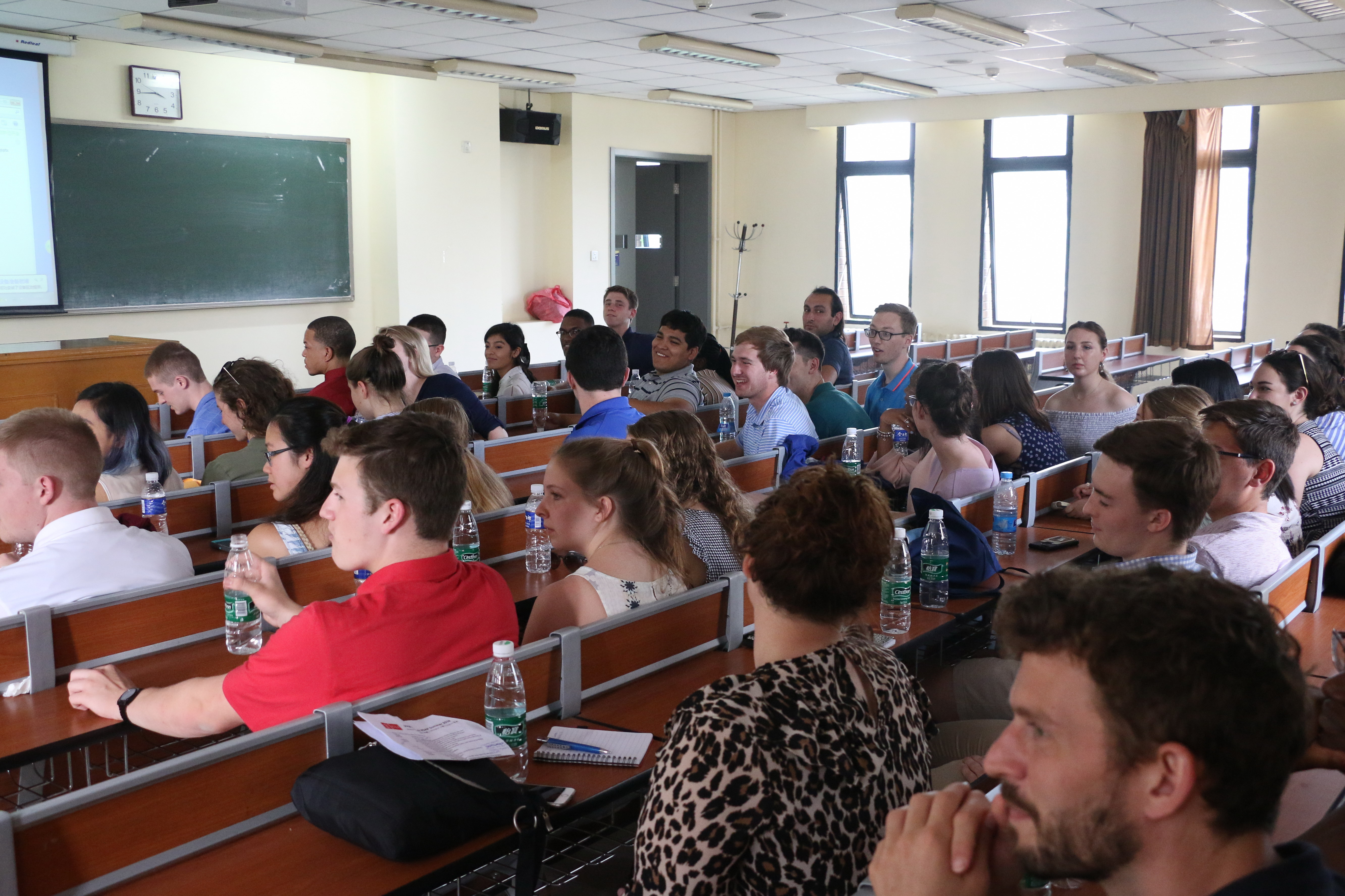 ——2018年5月16日、31日下午,由pg娱乐电子游戏官网入口与中国国旅合作的“2018年美国创想ISLP国际交流项目”成功举办。来自美国、欧盟、澳洲等将近20个国家和地区的近90名优秀大学生前来我院参加学术讲座,并与我院师生交流。副院长李莉文教授主持,副院长谢韬教授作主题讲座。30余名志愿者参加了活动。