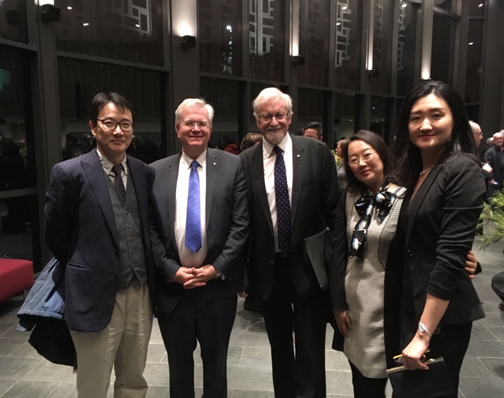 [研究会副秘书长、北外澳研中心副主任胡丹老师(右一)代表研究会出席成立仪式,左起:纽约大学教授张旭东、澳国立校长Brian Schmidt,荣誉校长Gareth Evans,四川师大澳研中心副主任李涯]