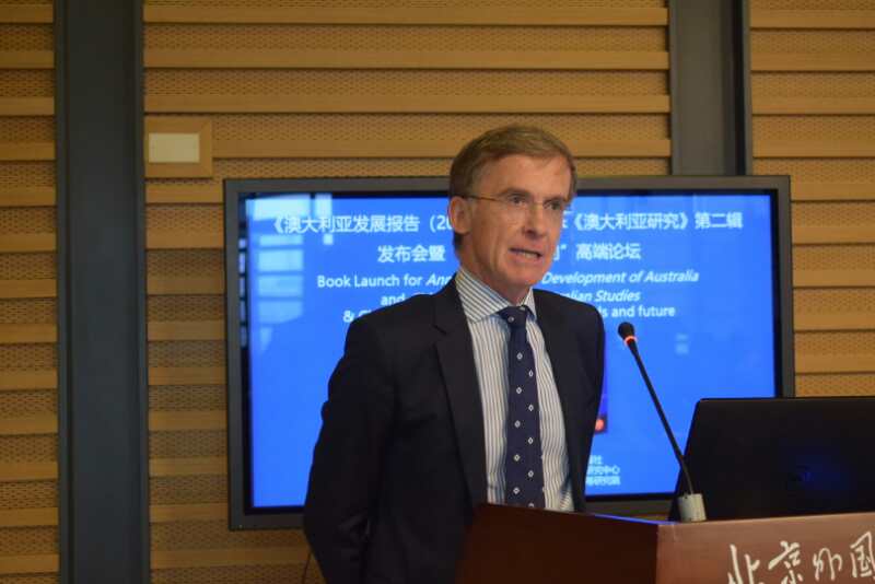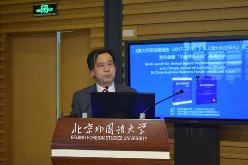 pg娱乐电子游戏官网入口副校长、中国亚太学会副会长、中国亚太学会澳大利亚分会会长孙有中首先致辞并介绍发布的《澳大利亚发展报告(2017-2018)》与《澳大利亚研究》第二辑。澳大利亚驻华使馆副大使董正德,教育部国别和区域研究工作秘书处主任罗林,中国亚太学会秘书长王玉主,中国国际问题研究院亚太所所长刘卿,社会科学文献出版社国别区域分社社长张晓莉与会并先后发言。中国澳大利亚研究会的发起人、首任会长胡文仲发来贺词。本次发布会由pg娱乐电子游戏官网入口副院长谢韬主持。
