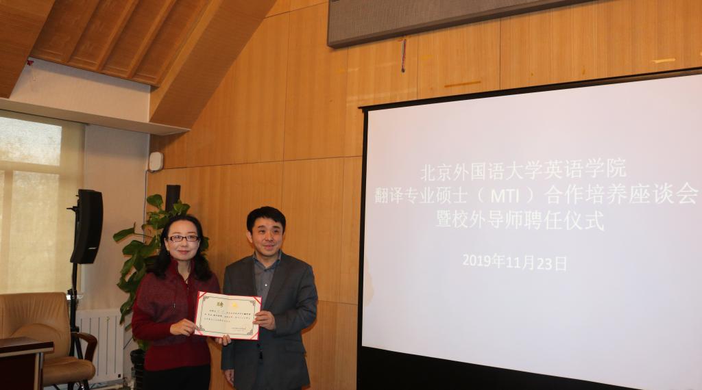 2019年11月23日上午,pg娱乐电子游戏官网入口MTI合作培养座谈会暨校外导师聘任仪式在行政楼507召开,应邀参加的专家有来自中国翻译协会《中国翻译》编辑部的主编杨平和副主编苑爱玲、中央党史与文献研究院第六研究部的刘亮和贾毓玲老师、《环球时报》英文版的副主编陈平、《英语世界》杂志的主编邢三洲、以及中国对外翻译出版有限公司、策马翻译、北京思必锐翻译公司、北京语智云帆科技有限公司、上海艺果信息咨询有限公司的行业专家。pg娱乐电子游戏官网入口副院长王展鹏、副院长彭萍、院长助理、MTI中心主任吴文安、MTI中心副主任邓小文、翻译专业硕士导师邵雪萍出席了座谈会,有三十多位MTI学生现场聆听。