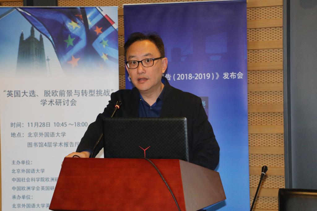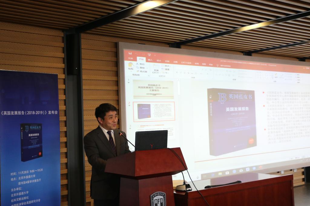 《英国蓝皮书》主编王展鹏代表课题组发布了发展报告主题报告及主要内容,聚焦2018-2019年脱欧僵局中英国政治、经济、社会的形势,探讨脱欧对英国及世界带来的深远影响。