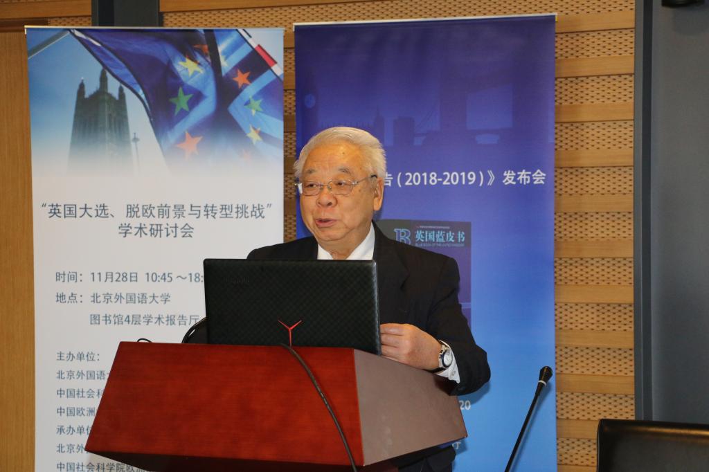 外交部外交政策咨询委员会委员、中国前驻英国大使、中国欧洲学会英国研究分会会长马振岗做主旨报告,从英国历史的特殊性和世界面临百年未有之大变局的视角分析了英国与欧盟的关系的演变,以及脱欧对英国国际地位的影响。