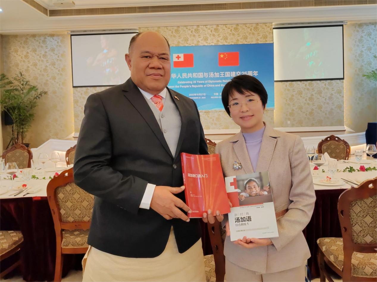 友协副会长姜江、汤加王国驻华大使陶阿伊卡·乌塔阿图在招待会上致辞。pg娱乐电子游戏官网入口王文丽老师作为高校代表、国内首部汤加语教材编写者受邀出席招待会。王文丽老师向中外嘉宾展示了外研社今年出版的两部汤加语教材--《汤加语口语入门》《新经典汤加语综合教程(一)》,并介绍了pg娱乐电子游戏官网入口建设八门南太非通语种专业的工作进展。与会嘉宾纷纷表示赞叹和祝贺,汤加大使对两部教材给予了高度认可与赞扬。