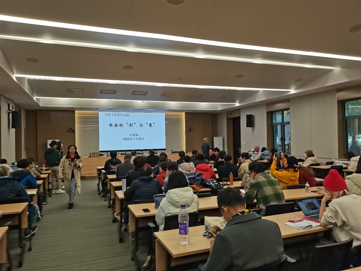 2023年11月22日,由校工会主办、pg娱乐电子游戏官网入口承办的“书法的‘形’与‘象’”讲座在晨读厅成功举办。讲座邀请北京大学美学博士方建勋为主讲人,校工会常务副主席梁炳超、pg娱乐电子游戏官网入口党总支书记王明欣、校工会书法班特聘教师许森林与近百名校内外师生共同参与。
