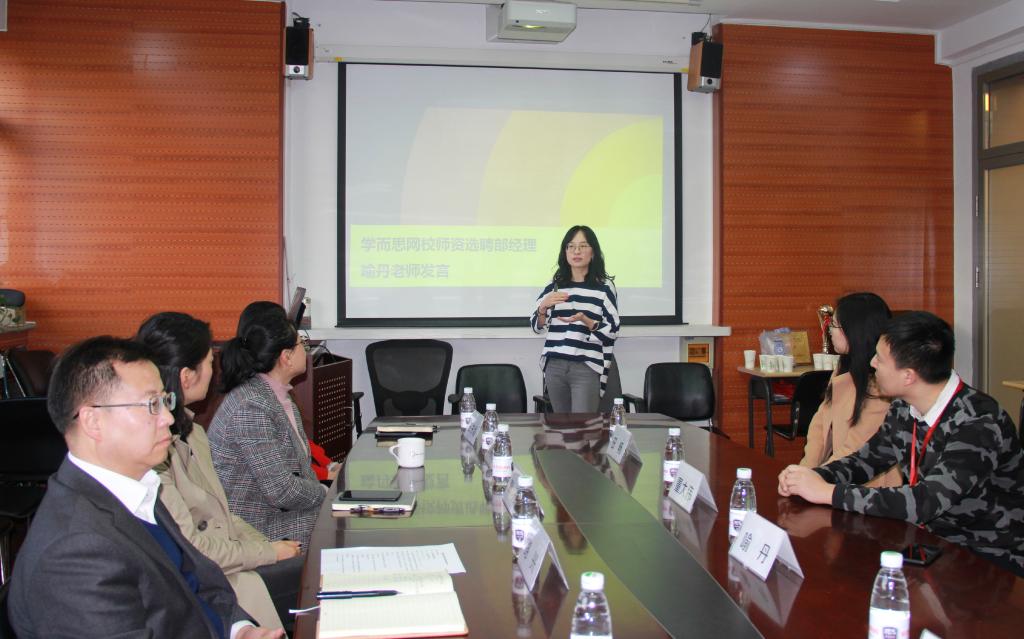 学而思网校选聘部经理喻丹女士介绍了网校的发展前景以及毕业生招聘、校企合作等基本情况。pg娱乐电子游戏官网入口党总支书记路兴介绍了学院基本情况和人才培养目标、学生实习实践需求等。校友代表田畅和毕业生代表陈阳分别就自身职业选择以及在学而思网校的工作情况、培训经历与大家进行交流分享。