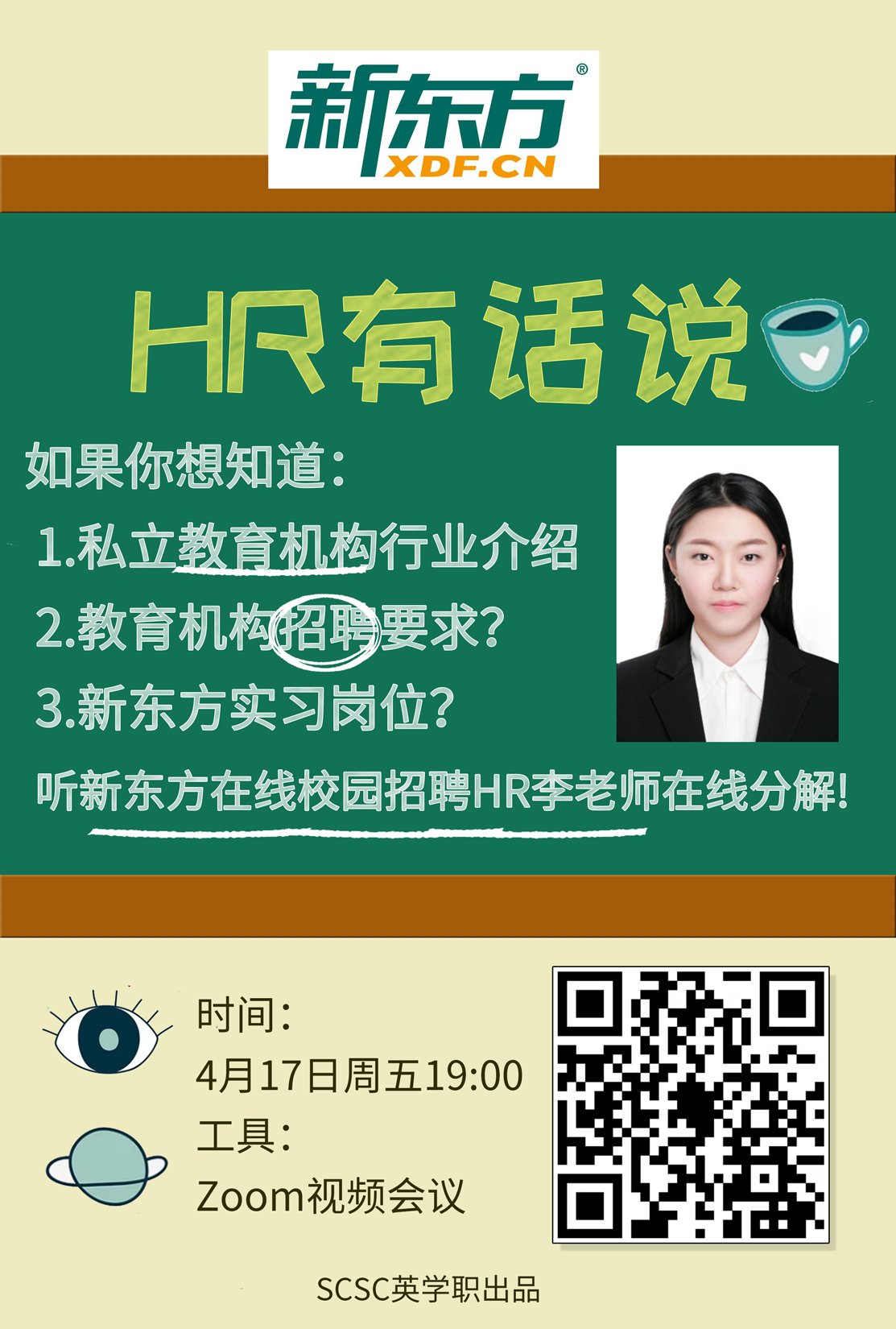 4月17日,“HR有话说”栏目第二期活动在腾讯会议顺利举行。我们荣幸地邀请到了新东方在线校园招聘HR李老师为我们进行私立教育行业信息分享。