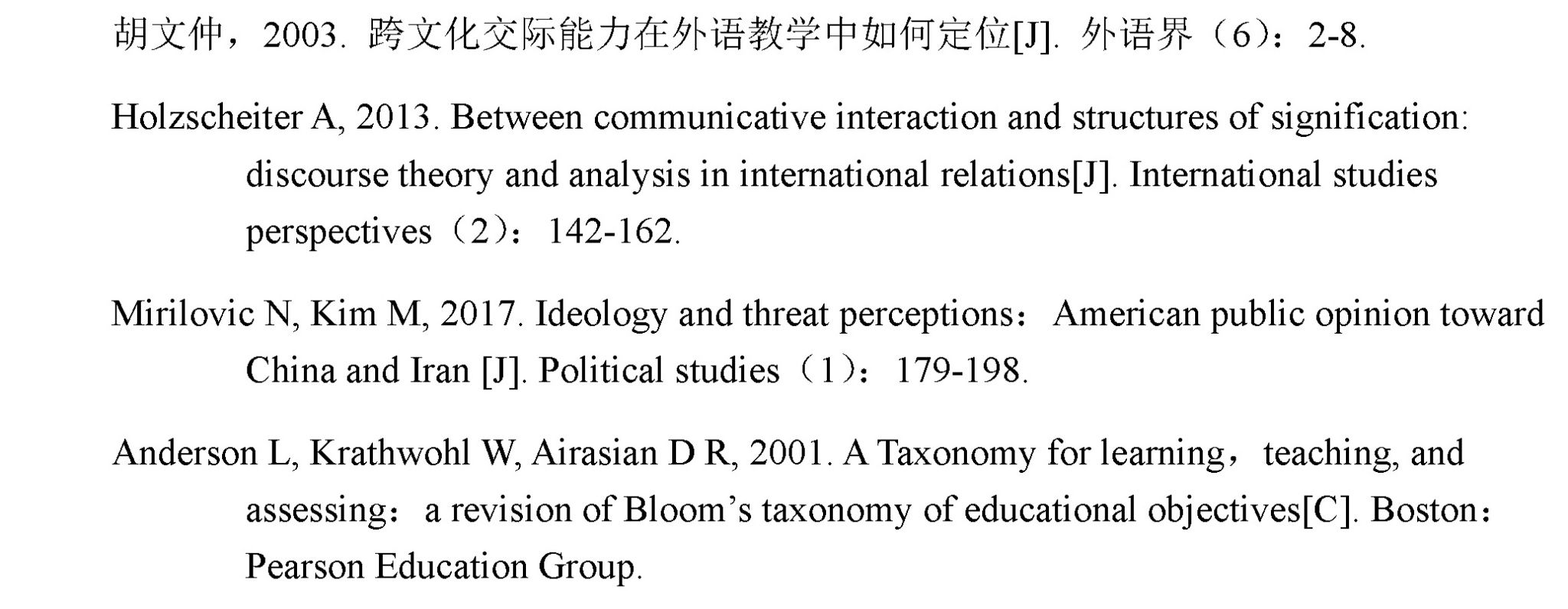 期刊论文书写顺序为:作者、出版年份、文题、标识码、刊名(不标出书名号)、期数、所引论文起止页码,具体示例: