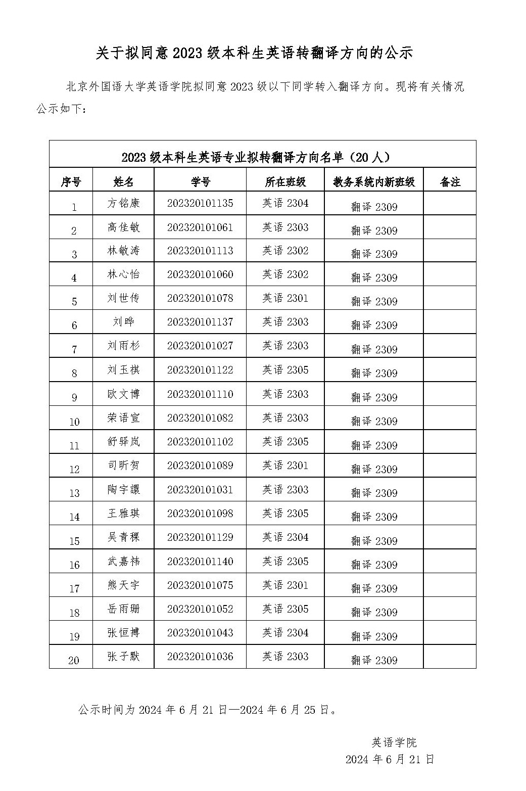关于拟同意2023级本科生英语转翻译方向的公示